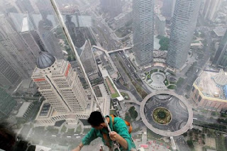 Beginilah keadaan pencuci tingkap bangunan tinggi di China..Gambar ini diambil di Oriental Pearl TV Tower di Shanghai yang menunjukkan keadaan pencuci tingkap yang bekerja di ketinggian melabihi 460 meter..!!